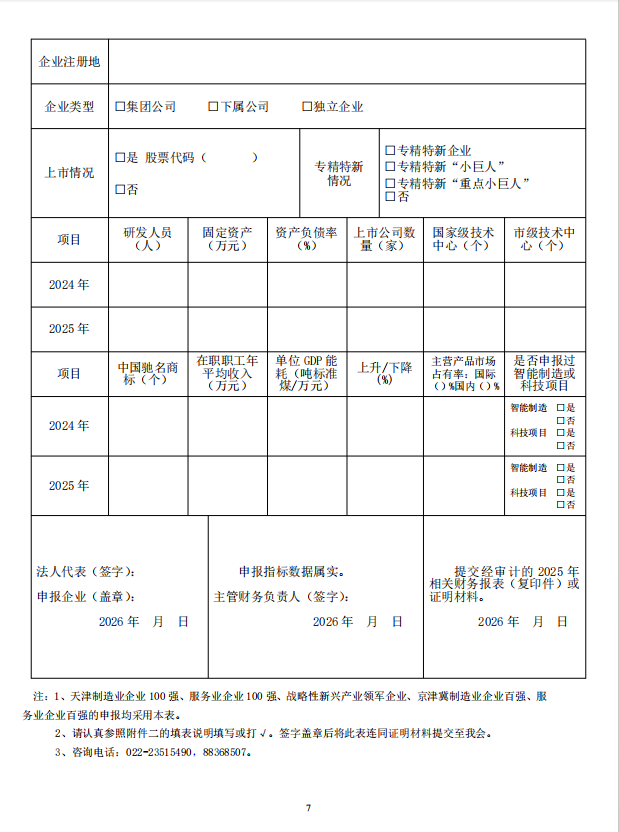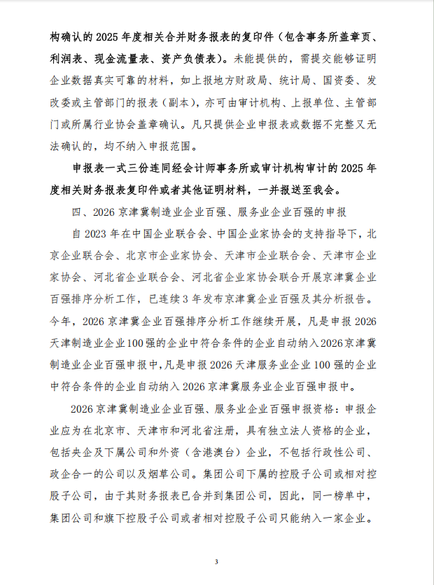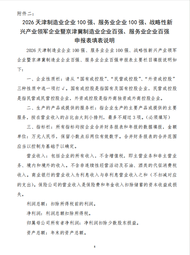 关于开展2026 天津制造业企业 100 强、服务业企业 100 强、战略性新兴产业领军企业暨京津冀制造业企业百强、服务业企业百强排序分析工作的通知