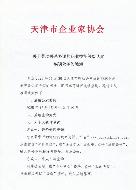 关于劳动关系协调师职业技能等级认定成绩公示的通知